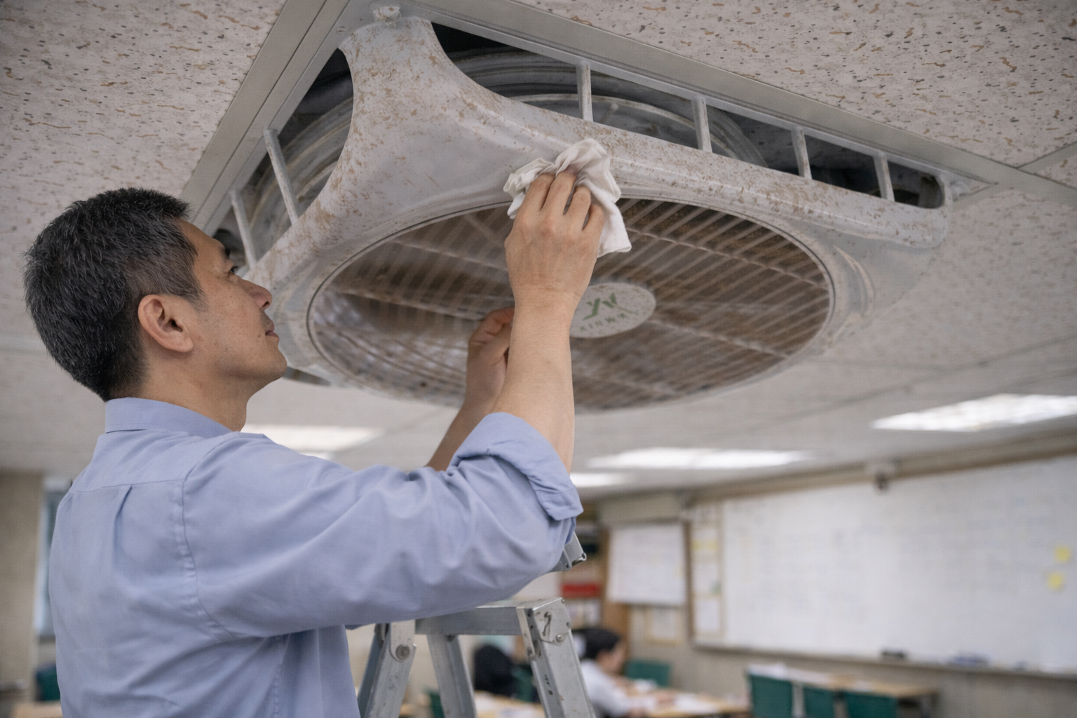第二個重點則是確認設備固定狀態與作業環境穩定性。高處作業時應避免單人勉強操作,並確保梯具穩固、地面平整,防止因重心不穩而發生跌落意外,這項原則對於安裝在輕鋼架天花板上的循環扇尤其重要,因其位置高、視角受限,更需要謹慎處理。