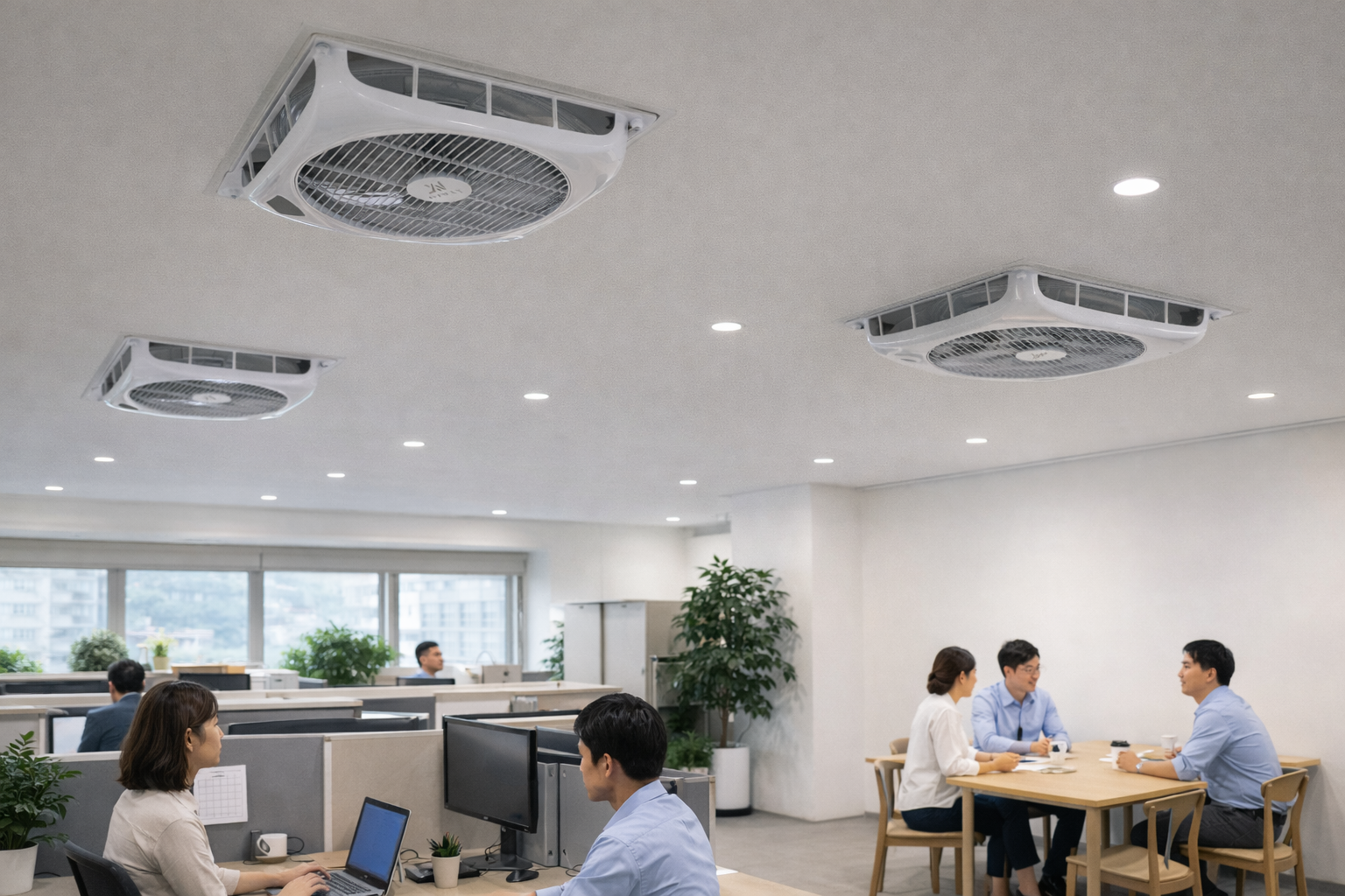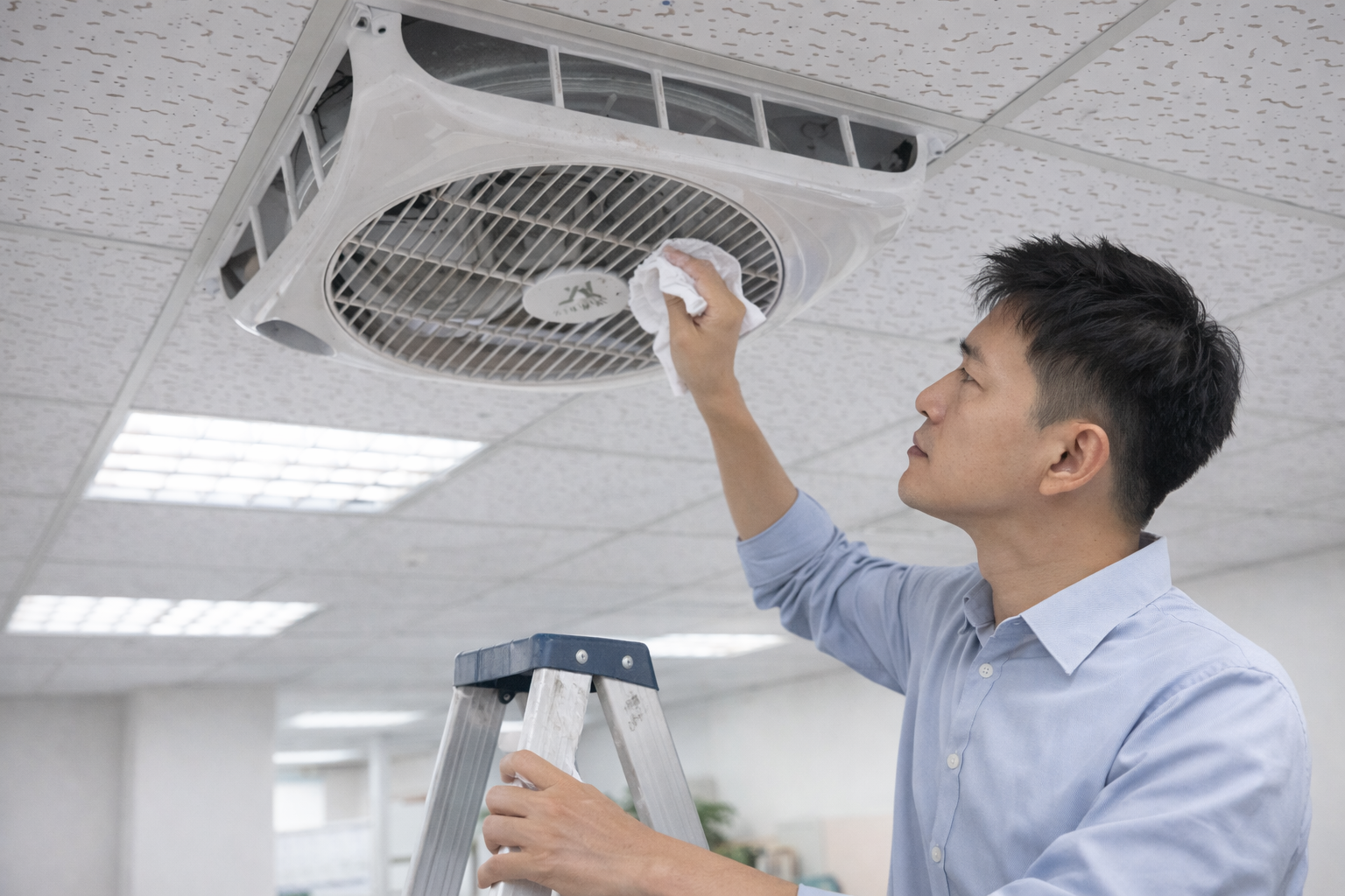 辦公室與補習班的輕鋼架循環扇,雖然不像餐廳有油煙問題,但因長時間運轉、使用密集,灰塵與人體活動產生的微粒仍會慢慢堆積。一旦清潔不完全,異味往往在冷氣搭配使用時特別明顯。