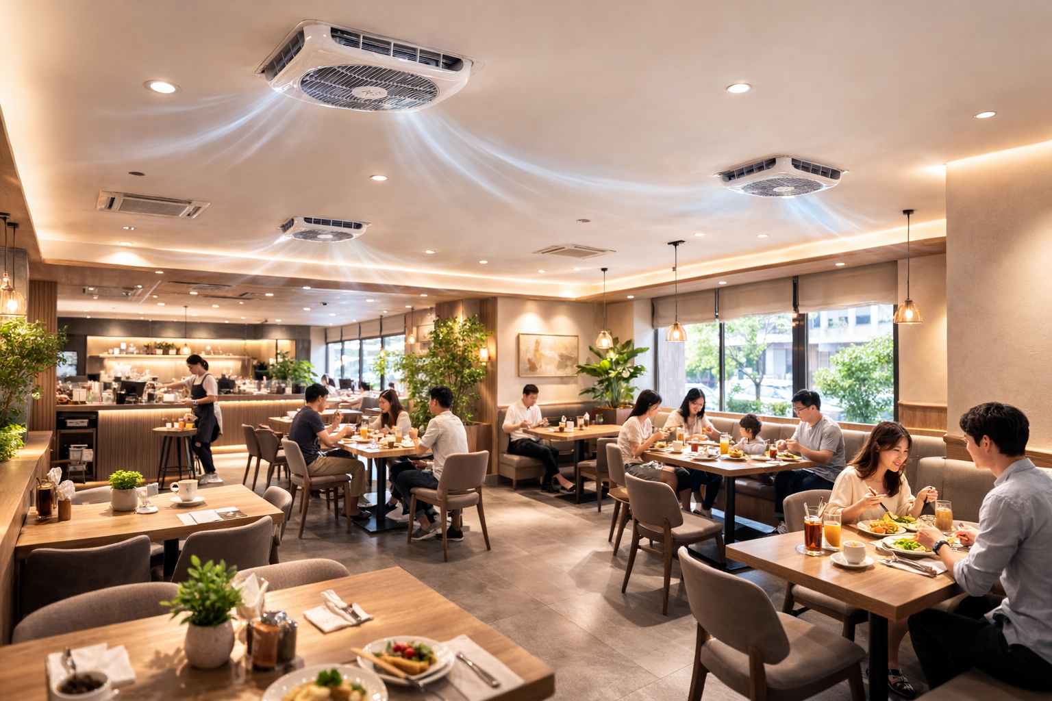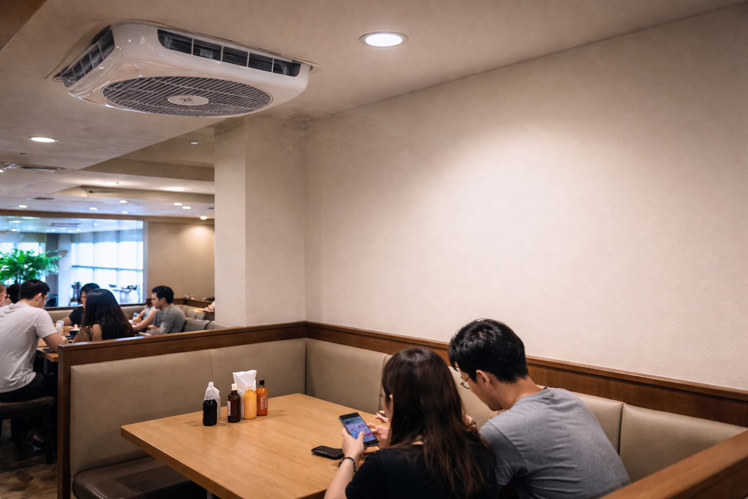 小坪數餐廳空間集中、熱源密集,若空氣無法快速流動,很容易累積悶熱感。常見狀況是冷氣一開就很冷,但人一多就開始不舒服。透過風場調整,讓氣流在短距離內形成循環,可有效改善體感不均問題。環境部 也指出,小空間更需要穩定的空氣交換來維持舒適度。