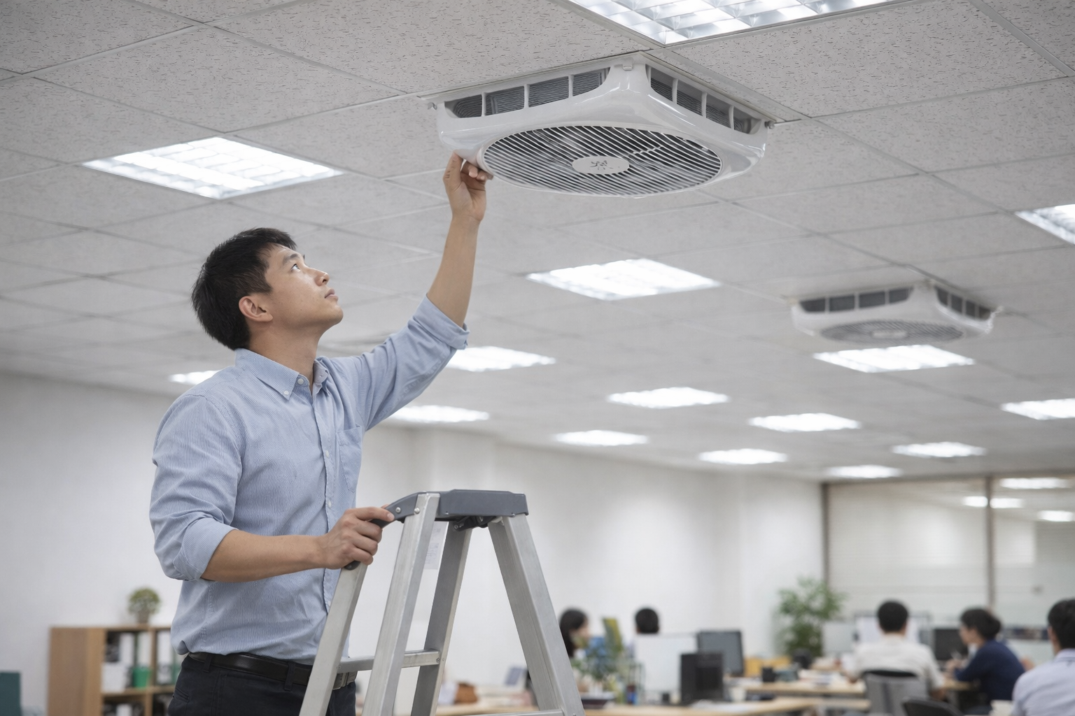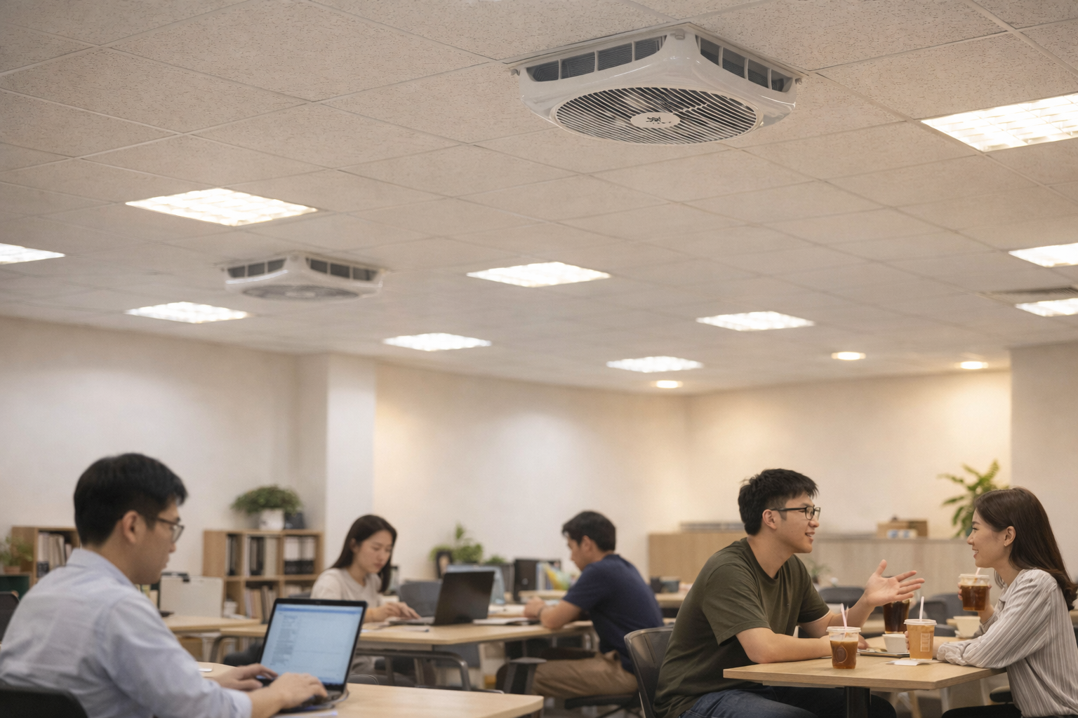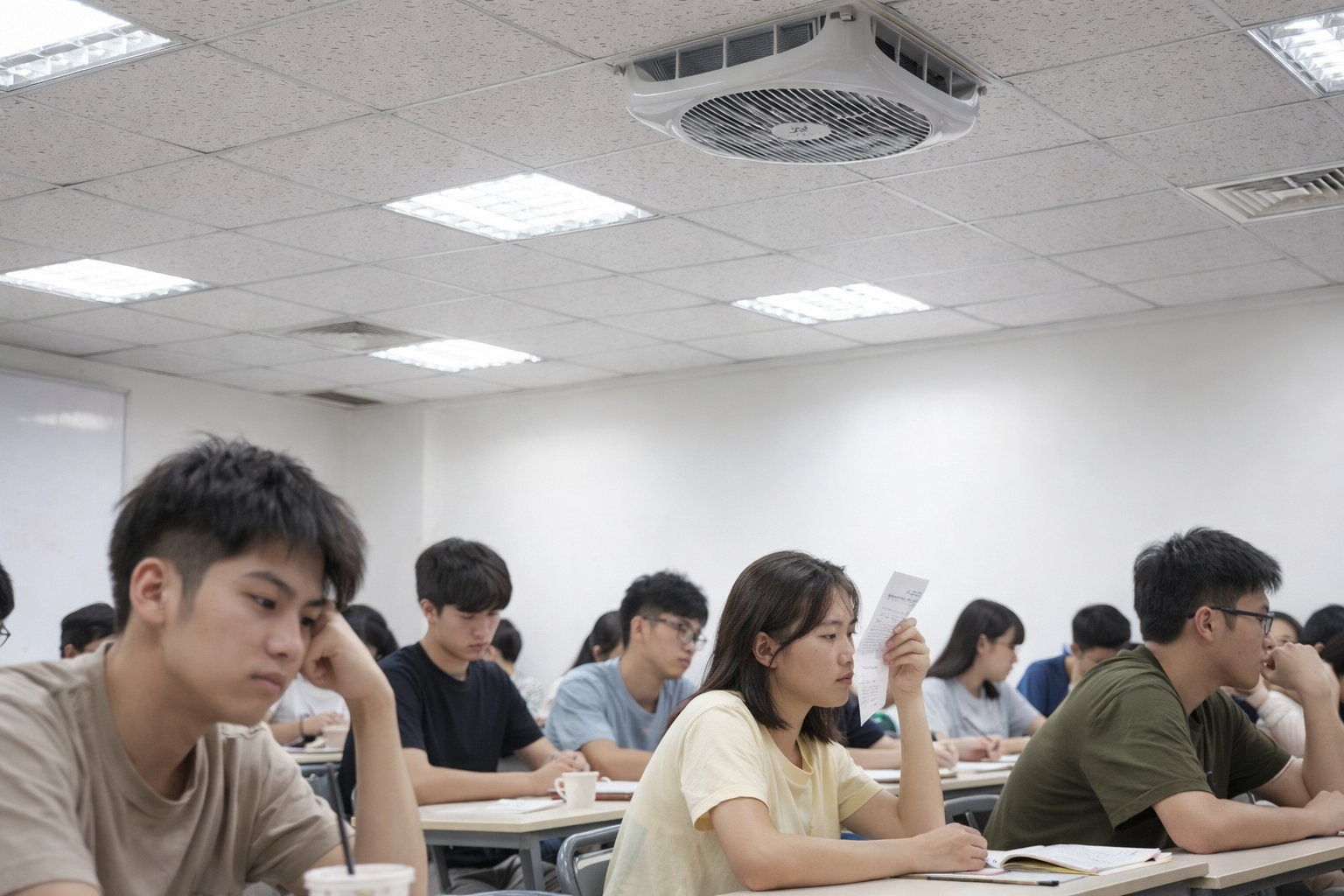輕鋼架循環扇若風向太平、出風太貼近天花板,風就會在上方循環打轉,看似有風其實人坐著的高度依然悶。常見在靠牆座位、教室後排、辦公室角落位。依勞動部職安署的通風觀念,通風重點是有效帶走污濁空氣,而非只有風在動。